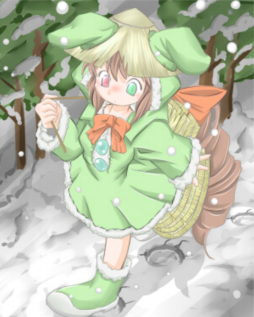 家の周囲は雪に覆われ、野生の実装石は望めません。 多分、雪の下で氷漬けになっているか冬眠しているか… どちらにしても見つけるのは困難です 「こまったですぅ、そうだ!ふもとの村 まで出れば 生実装を手に入れられるかもしれないですぅ」 「じゃ、私がちょっと村まで行ってくるてち!ママは小屋を直しててちぃ」 「じゃ村で交換してもらうものが必要ですぅ 今、家で余ってるものと言えばこれくらいだけど・・」 そう言ってママが出してきたのは雪傘でした ちなみにこの地域の実装人はまだお金の概念がないので基本物々交換です 「それじゃ、村でこの傘と生実装を交換してもらってくるてちぃ~」 ペトラは傘をもってふもとの村へと歩き出しました