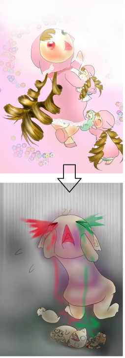 どうしよう。 私の飼っている実装石、ミドミドちゃんが妊娠しちゃったよ! 私は変な事していませんよ?フツーにお風呂に入れて、フツーに着替えして フツーに実装石のパンツを外で干していたら妊娠していたのよ! あとでネットの実装石掲示板で聞いたら、 この季節にはパンツにスギ花粉がついて妊娠するから 実装服、とくにパンツは部屋干しするのが普通なんだって! ええー、聞いてないよ!ヽ(`Д´)ノプンプン 目を染めて妊娠をなかった事にするのは簡単だけど デッデロゲーって歌ってお腹をなでる姿をみたら、ねぇ。 やっぱりかわいそうじゃない? で、産まれちゃったのが仔実装2石とウジ実装。 まぁネットで里親を探して飼ってもらえばいいや ぐらいに考えていたんだけど、これが難しい難しい。 (つд⊂)エーン、みんな薄情だよ!世間は厳しいよ。 ウンチダダモらしのバカ仔と、すぐ死ぬ先天性蛆実装は需要がないんだって! 正直毎日毎日あちこちにウンチを漏らす仔たちに、私もうんざり。 だって私はちゃんと仕事しているんだもん(`・∀・´)エッヘン!!偉いでしょう? だからそんなバッチイ事の世話まで出来ないじゃない?フツー。 あわててミドミドには避妊手術をしたけれど、すっごい高額だった。 最近は色が変わらないように眼球タトゥーをするんだって。なにそれこわい。 ちなみに仔には施術できないって。 できても無理無理。そんなお金はらえないよ! それにしても、もぉ部屋中ベトベトだよ!こまったなぁ。どうしよう。 でもとうとうお店のバックヤードで言われちゃった! 「くっさい。」 すっごいショック!あんまりだよ!言い方ってあるじゃない? こっちの事情も察してよ、もっとやさしく言ってくれればいいのに。 もしくはだまって香水くれるとかさ。気が利かないよね。まったく。 でも私ももう限界!そしたら客からイイこと聞いちゃった。 「そろそろ公園デビューしないとね!可愛い仔たちを見せびらかそう!」 こう言えば全部解決するんだって。 どうしてなんだろう?ま、いいか。 とにかくチャレンジチャレンジ!とりあえずやってみよう! うまくいきました、いきましたよぉー!もっと早くやればよかった。 保健所とかに持っていくのはギルティだけど、これなら私のせいじゃないよね。 ミドミドの髪の毛はむしられちゃったけど、見事仔たちは死んでくれました。 やったね!(●^o^●) でもミドミドったら死体もってきちゃったよ。気持ち悪い。(´・д・`) でね。変なの。 蛆はポンポコリンにふくれあがっちゃっていて 両目は真っ白なんだけどかすかに緑なの。 仔の1石もかすかに両目が緑なの。 で、なんかちっちゃい胎児っぽいのがお腹からこぼれておちているの。 もう一石はビミョーに両目が赤なの。それで干物みたいになっちゃっているの。 なんでこんな事になったんだろう?リンガルないからわからないや。 リンガルアプリみたいなのもあるらしいけど、 操作とか難しいからよくわからないし。 不思議! 困ったのはミドミドのつるつる頭! このままじゃみすぼらしくて嫌。 みっともなくて連れて歩けないよ!(つд⊂) でも私かしこいから解決方法みつけちゃった。 エクステに使おうと思ってとっておいたんだ。 じゃじゃーん。このまえバッサリ切った私の髪の毛! これを埋め込んじゃいます。 どうするのかって?針でチクチクってやって埋め込むの。 羊毛フェルトでマスコットつくるみたいにするんだ。楽しい。 ミドミドは泣いちゃっているけど仕方ない。 オシャレは我慢!これ良い言葉だよね? 黒髪なのもポイント高い。なんかプレミアついてるんだよね?黒髪実装。 女の子も黒髪のほうが男ウケがいいんだよねぇー。 私も本当はロイヤルミルクティー色にしたいんだけどねぇー。 で、このカールアイロンでクルクルっとね。 実装石の髪って洗っただけで縦巻きロールなの、ちょっとうらやましいよね。 人間の髪の毛で作ろうとするとけっこうテクニックがいるんだよ? よし、これでばっちり!黒髪実装石、もぉすごいかわいい! よぉーし。見せびらかしてこよう!☆(ゝω・) 「そ、その黒髪!どうしたんですか?な…なんてめずらしい!」 なんか気持ち悪いおっさんに声をかけられた。でも悪い気はしない。 「えへへへ、すごいでしょ!私が作ったの!」 「えええええ!あ、あ、あ、あなたが!あなたのような女性が!?」 おっさんすっごいビビっている!うふふ、驚いたかこの超絶テクニック! 「そう、私が作ったの。このロールなんてコテ巻きを何度もやり直して…」 言い終わらないうちにアタマを衝撃がつらぬく。 うそ!おっさんに殴られた? あの…おっきな…石…血まみれの…あれは私の血… 私は意識がうすれ、まっくらな闇に落ちていった。 「そうか、実装石を孕ませれば黒髪ができると思っていた。 違ったんだ!道理で!道理で! ノラ実装はもちろん、ノラに襲われていた飼い実装にまで 手を出して試したのに、いろいろ試したのに! ダメだったのはこのせいだったんだんだ。 孕ませるのじゃダメだったん