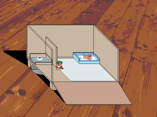 居間の遊び道具や材料の切れ端は隠しておき、仔がハウスだけに注視するよう環境を整えた。