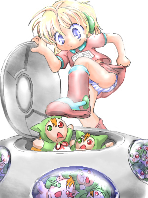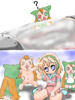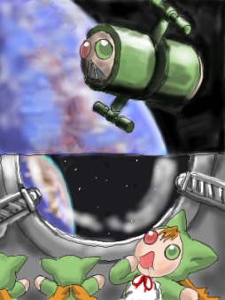 ステーション実装島は地球の軌道上を高速で移動し遠心力で軌道を維持しています カプセルを地上に降ろすには減速し、遠心力を弱めなくてはなりません 実装石を詰め込んだカプセルは本来の適正重量を超えていたため正月は軌道を計算し直しました 正月の計算では、減速時に通常の2倍の衝撃がかかる以外は特に問題は無さそうでした カプセルの格納庫の空気を抜き始めると次第に床に溜まった糞が沸騰し、水蒸気となり始めました ちなみに正月はロボットなので、真空でもへっちゃらです 減速用ロケットに点火するとカプセルは急速に床を離れ 射出口へ向かってみるみる加速を始めました ところが、 カプセルに繋がっていたコードの1本が正常に離れず、 それが正月に絡み付いてしまったのです 正月とカプセル、そしてカプセルの中の実装石達は 一緒に実装島を離れ、そして地上へむかって飛び出 して行きました |
