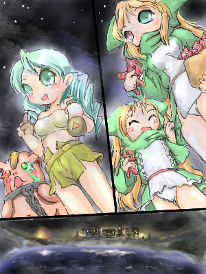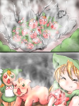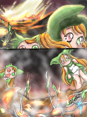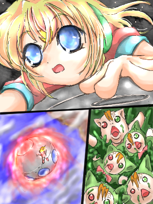 「うわ!こっちに来るデスゥ!」 みると、流れ星の1つがぐんぐんこちらに近づいてきています 星が大きくなるに従って、空気にビリビリという振動が伝わってきて、 やがて、ズドーン!という大きな音を立て流星は畑の一番端っこに落ちました 土砂と破片がバラバラと降り注ぎます すごい音と振動は世界の終わりが来たのか?と思わせる程でしたが それも一瞬のこと、世界は再び夜の静寂を取り戻します ただ一つ、まだもうもうと煙を上げている畑の端にできた大穴を除いて 「うわ・・・、星がおちてきたてちぃ~ 星が落ちてきたということは お願いがかなったりするてち?どうせなら伝説の食べ物、コンペイトウ でもお願いすればよかったてち?」 「デスゥゥ!ワタシの可愛い耳がぁぁぁぁぁあ!」 どうやら物騒な流れ星はミドリの耳を掠めて落ちたようです 大穴に近づいてみると、穴の周りは熱で土砂が真っ赤に焼けており、 その中心になにか銀色のがらくたが見えます 不思議とがらくたの中の温度はそれほど高くないらしく、 真っ赤になっているのは、その一部だけのようです 「これは・・・何てち・・・?」 「きっと星が落ちてきたんだから、コンペイトウに違いないデス!」 熱くて近づく気にならなかった二人は、近くの倒木でがらくたをつついてみることにしました |