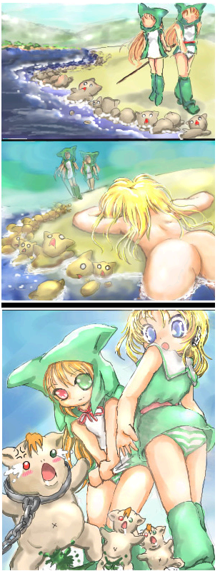 浜辺が大変なことになっているのを発見しました あの畑に落ちた実装石はほんの一部だったのです これには実装人達もびっくりです 「もったいないですぅ~」 死体を目当てに実装魚が集まってきている 様子を見ながら歩いていると、 なんと浜に"人"が倒れているではありませんか 「だれか倒れているですぅ」 そして・・・・ 片田舎の小さな漁村に空からふってきた新しい住人が加わりました 彼女の名は正月 |